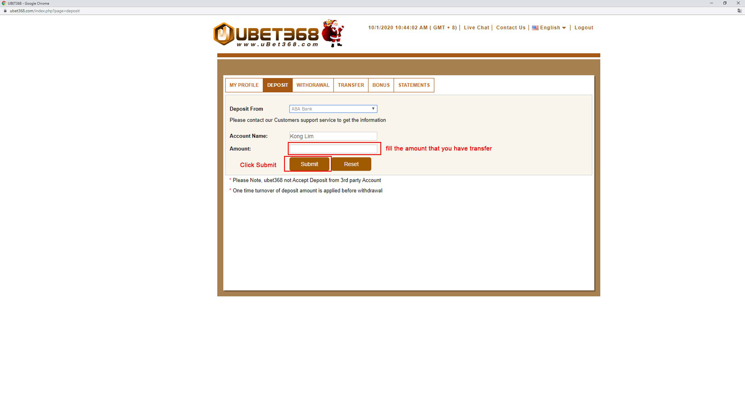 5.Transfer fund to uBet368's ABA account that provided by Customer service then fill it to deposit form,Click here to know how to transfer by ABA Bank.